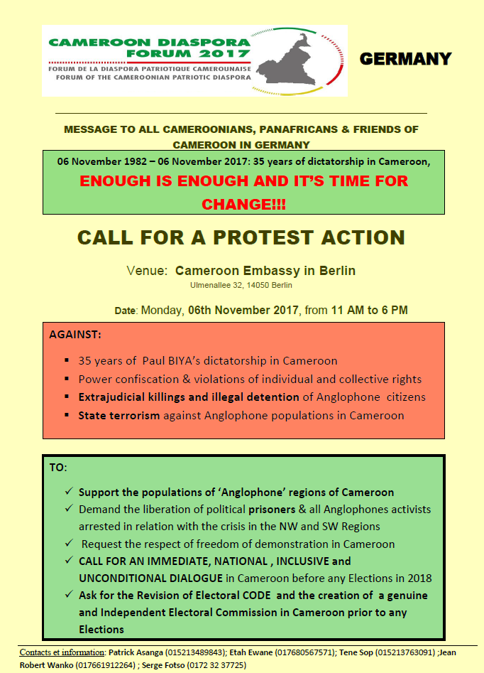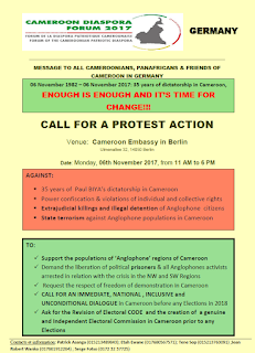 Join the demonstration on November 6, 2017, Cameroon Embassy, Ulmenallee 32, 14050 Berlin - S Westend